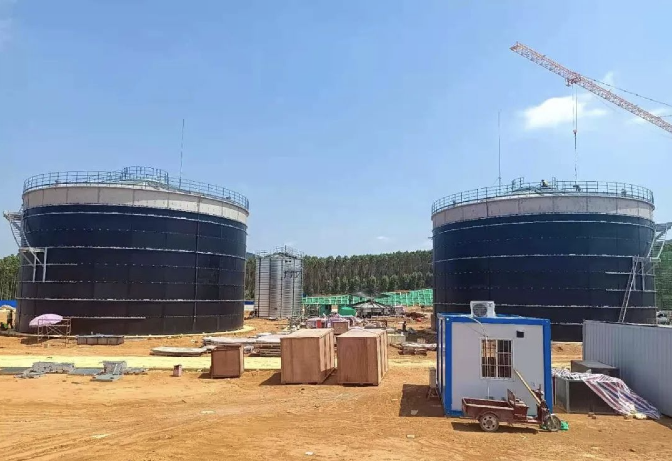 Project:項目 WWTP ChelmzaConstruction Site:安裝地Chemlza / Poland波蘭1x 2500m3Anaerobic Digester , 1x 1300 m3PreacidificationTank, both with Heavy duty roof and topring AISI 316, Tankshell in CSglasscoated, incl. Insulation and cladding, 1x 1800 m3Thicknertank open top1x 2500m3厭氧消化罐和1x 1300 m3水解酸化罐帶,兩個罐子均采